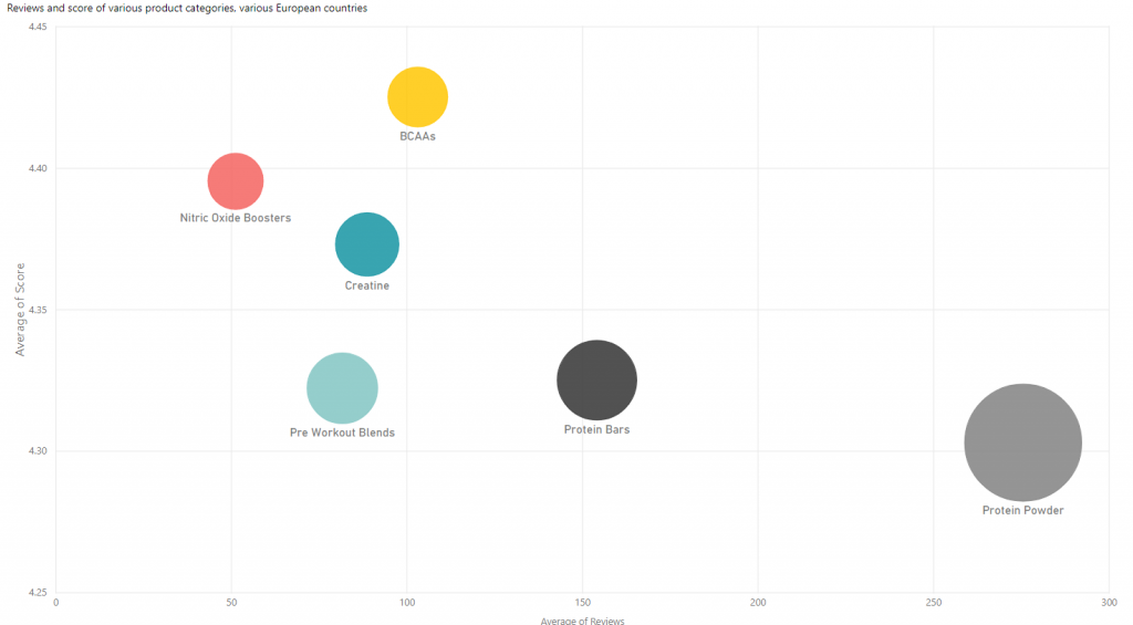 The USA has a much higher expectation of products, as such products on average score lower. BCAAs shoot ahead, with over 3000 reviews on average per product. Protein powder still performs well, and only appears slightly less well-performing due to the comparative shape of the market. We see the traditional body-building sectors move to the bottom left of the graph as they don’t attain significant appeal due to the small size of their traditional demographics, and the low scores due to the high expectations of the user.